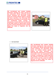The non-disclosed part contains detailed information regarding the modus operandi of law enforcement officials performing border control. Disclosing such information would expose the working methods applied in ongoing and future operations, thus obstructing their effectiveness in prevention of cross-border crime and At unauthorized border reaching the B-pillar, crossings. In watch out consequence, it would for the range undermine the protection of the door. of the public interest as regards public security and thus, cannot be disclosed pursuant to Article 4(1)(a) first indent of Regulation (EC) No 1049/2001. 3. Car boot check The non-disclosed part contains detailed information regarding the modus operandi of law enforcement officials performing border control. Stay inDisclosing a V-position.such information would expose the working methods applied in ongoing and Don’t stay withinfuture the range operations, of thus obstructing their effectiveness in prevention of the boot door. cross-border crime and unauthorized border crossings. ControlIn theconsequence, movement of it would undermine the the protection boot doorofwith theyour public interest as regards public security and thus, cannot be disclosed hand. pursuant to Article 4(1)(a) first indent of Regulation (EC) No 1049/2001. __________________________________________________________________________________ 61
