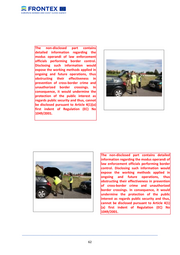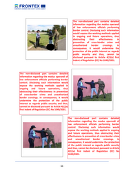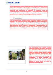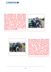 The non-disclosed part contains detailed information regarding the modus operandi of law enforcement officials performing border control. Disclosing such information would expose the working methods applied in ongoing and future operations, thus –obstructing Standing position on the patroltheir effectiveness in car, with prevention of cross-border handcuffs, step 2 crime and unauthorized border crossings. In consequence, it would undermine the protection of the public interest as regards public security and thus, cannot be disclosed pursuant to Article 4(1)(a) first indent of Regulation (EC) No 1049/2001. The non-disclosed part contains detailed information regarding the modus operandi of law enforcement officials performing border control. Disclosing such information would expose the working methods applied in ongoing and future operations, thus obstructing their effectiveness in Standing position – on the patrol prevention of cross-border crime and unauthorized car using handcuffs, frisk the border crossings. In consequence, it would covered parts, step 3 undermine the protection of the public interest as (threatening). regards public security and thus, cannot be disclosed pursuant to Article 4(1)(a) first indent of Regulation (EC) No 1049/2001. The non-disclosed part contains detailed information regarding the modus operandi of law enforcement officials performing border control. Disclosing such information would expose the working methods applied in ongoing and future operations, thus obstructing their effectiveness in Standing prevention position of – on the cross-border crime and patrol car, step 1 (sensitive or unauthorized border crossings. In consequence, it threatening). would undermine the protection of the public interest as regards public security and thus, cannot be disclosed pursuant to Article 4(1)(a) first indent of Regulation (EC) No 1049/2001. __________________________________________________________________________________ 68