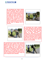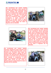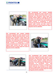 The non-disclosed part contains detailed information regarding the modus operandi of law enforcement officials Standing position – performing border control.at the Disclosing such information patrol car, step 1 (threatening). would expose the working methods applied in ongoing and future operations, thus obstructing their effectiveness in prevention of cross-border crime and unauthorized border crossings. In consequence, it would undermine the protection of the public interest as regards public security and thus, cannot be disclosed pursuant to Article 4(1)(a) first indent of Regulation (EC) No 1049/2001. The non-disclosed part contains detailed information regarding the modus operandi of law enforcement officials performing border control. Disclosing such information would expose the working methods applied in ongoing and future operations, thus Standing position – at the obstructing their effectiveness in prevention patrol car, step 2 of cross-border crime and unauthorized (threatening). border crossings. In consequence, it would undermine the protection of the public interest as regards public security and thus, cannot be disclosed pursuant to Article 4(1) (a) first indent of Regulation (EC) No 1049/2001. The non-disclosed part contains detailed information regarding the modus operandi of law enforcement officials performing border control. Disclosing such information would expose the working methods applied in ongoing and future operations, thus obstructing their effectiveness in prevention Standing of cross-border crime and unauthorized position– on the patrol border crossings. In consequence, car, with handcuffs, step 1 it would undermine (threatening). the protection of the public interest as regards public security and thus, cannot be disclosed pursuant to Article 4(1)(a) first indent of Regulation (EC) No 1049/2001. __________________________________________________________________________________ 67