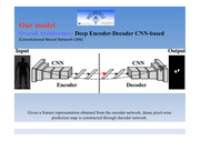 Our model Overall Architecture: Deep Encoder-Decoder CNN-based (Convolutional Neural Network CNN) Given a feature representation obtained from the encoder network, dense pixel-wise prediction map is constructed through decoder network.