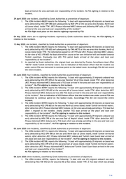 boat arrived at the area and took over responsibility of the incident. No FSA sighting in relation to this incident. 29 April 2020: one incident, classified by Greek Authorities as prevention of departure: 1. The JORA incident 406283 reports the following: “A boat with approximately 40 migrants on board was early detected by HCG OPV 080 and subsequently by BGR CPV at the sea area Akra Korakas, North East of Lesvos island, inside TTW. JRCC Piraeus informed MRCC Ankara and following VHF calls, a TCG boat arrived at the area and took over responsibility of the incident”. No FSA flight took place on this date/no sightings reported by FSA 04 May 2020: there are no sightings/incidents reported by Greek Authorities dated 04 May. No FSA sighting in relation to this incident. 13 May 2020: one incident, classified by Greek Authorities as prevention of departure: 1. The JORA incident 406393 reports the following: “A boat with approximately 40 migrants on board was early detected by HCG CPB 602 and subsequently by FWA METIS at the sea area Akra Korakas, North of Lesvos island inside TTW. The information passed to CZE TVV and JRCC Piraeus informed MRCC Ankara. At the view of HCG CPB 602 the boat altered her course on her own initiative/will and headed towards Turkish coastlines. Eventually two (02) TCG patrol boats arrived at the place and took over responsibility of the incident”. 2. As reported by Greek Authorities, the migrant boat was detected by Frontex Surveillance Asset (FSA) “METIS” inside Turkish territorial waters. Due to indication of HCG liaison officer that the incident was under control FSA was instructed to continue patrol on the tasked route. Accordingly FSA did not record the entire incident. 04 June 2020: four incidents, classified by Greek Authorities as preventions of departure: 1. The JORA incident 407062 reports the following: “a boat with approximately 35 migrants onboard was early detected by HCG OPV 070 at the sea area "Neniton" SE of Chios island, inside TTW. After detection JRCC Piraeus informed MRCC Ankara and a TCG boat arrived in the area and took over responsibility of incident”. No FSA sighting in relation to this incident. 2. The JORA incident 407091 reports the following: “A boat with approximately 40 migrants onboard was early detected by HCG CPB 602 at the sea area NE of Lesvos island, inside TTW. After detection JRCC Piraeus informed MRCC Ankara and two (02) TCG boats arrived in the area and took over responsibility of the incident”. Due to indication of HCG liaison officer that the incident was under control FSA was instructed to continue patrol on the tasked route. Accordingly FSA did not record the entire incident. 3. The JORA incident 407094 reports the following: “A boat with approximately 30 migrants on board was early detected by HCG CPB 602 at the sea area North of Lesvos island, inside Turkish territorial waters. After detection JRCC Piraeus informed MRCC Ankara. At the area was already patrolling a TCG boat but didin' t respond to the incident, finally another TCG boat arrived at the place and took over responsibility of the incident”. No FSA sighting in relation to this incident. 4. The JORA incident 407100 reports the following: “A boat with approximately 09 migrants onboard was early detected by HRV CPB at the sea area East of Megisti island, inside TTW. After detection JRCC Piraeus informed MRCC Ankara and a TCG boat which was already patrolling in the area and took over responsibility of the incident”. No FSA sighting in relation to this incident. 05 June 2020: two incidents, classified by Greek Authorities as preventions of departure: 1. The JORA incident 407113, reports the following: “A boat with approximately 30 migrants on board was early detected by HCG OPV 080 at the sea area North East of Lesvos island, inside Turkish territorial waters. After detection JRCC Piraeus informed MRCC Ankara and Turkish Coast Guard boat arrived at the place and took over responsibility of the incident”. No FSA sighting in relation to this incident. 2. The JORA incident 407188, reports the following: “A boat with approximately 35 migrants on board was early detected by HCG CPB 615 at the sea area East of Lesvos island, inside Turkish territorial waters. After detection JRCC Piraeus informed MRCC Ankara and Turkish Coast Guard boat arrived in the area and took over responsibility of the incident”. No FSA sighting in relation to this incident. 08 June 2020: three incidents, classified by Greek Authorities as preventions of departure: 1. The JORA incident 407256, reports the following: “A boat with one (01) migrant onboard was early detected by HCG FIB 1043 at the sea area NE of Kos Island, inside TTW. A TCG boat which was already 7/18