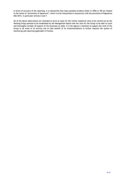 In terms of accuracy of the reporting, it is noteworthy that many pending incidents either in JORA or SIR are related to the notion of “prevention of departure”, which is to be interpreted in conjunction with the provisions of Regulation 656/2014, in particular Articles 6 and 7. All of the above observations are intended to serve as input for the further analytical work to be carried out by the Working Group planned to be established by the Management Board with the view for the Group to be able to cover and thoroughly consider all aspects of the processes at stake. It is the Agency’s intention to support the work of the Group in all areas of its activity and to take benefit of its recommendations to further improve the system of monitoring and reporting applicable in Frontex. 18/18