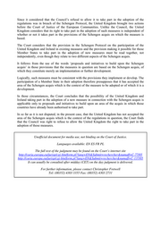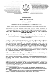 СЪД НА ЕВРОПЕЙСКИТЕ ОБЩНОСТИ EUROPOS BENDRIJŲ TEISINGUMO TEISMAS TRIBUNAL DE JUSTICIA DE LAS COMUNIDADES EUROPEAS AZ EURÓPAI KÖZÖSSÉGEK BÍRÓSÁGA SOUDNÍ DVŮR EVROPSKÝCH SPOLEČENSTVÍ IL-QORTI TAL-ĠUSTIZZJA TAL-KOMUNITAJIET EWROPEJ DE EUROPÆISKE FÆLLESSKABERS DOMSTOL HOF VAN JUSTITIE VAN DE EUROPESE GEMEENSCHAPPEN GERICHTSHOF DER EUROPÄISCHEN GEMEINSCHAFTEN TRYBUNAŁ SPRAWIEDLIWOŚCI WSPÓLNOT EUROPEJSKICH EUROOPA ÜHENDUSTE KOHUS TRIBUNAL DE JUSTIÇA DAS COMUNIDADES EUROPEIAS ∆ΙΚΑΣΤΗΡΙΟ ΤΩΝ ΕΥΡΩΠΑΪΚΩΝ ΚΟΙΝΟΤΗΤΩΝ CURTEA DE JUSTIŢIE A COMUNITĂŢILOR EUROPENE COURT OF JUSTICE OF THE EUROPEAN COMMUNITIES SÚDNY DVOR EURÓPSKYCH SPOLOČENSTIEV COUR DE JUSTICE DES COMMUNAUTÉS EUROPÉENNES CÚIRT BHREITHIÚNAIS NA gCÓMHPHOBAL EORPACH SODIŠČE EVROPSKIH SKUPNOSTI CORTE DI GIUSTIZIA DELLE COMUNITÀ EUROPEE EUROOPAN YHTEISÖJEN TUOMIOISTUIN EIROPAS KOPIENU TIESA EUROPEISKA GEMENSKAPERNAS DOMSTOL Press and Information PRESS RELEASE No 96/07 18 December 2007 Judgments of the Court of Justice in Case C-77/05 and Case C-137/05 United Kingdom of Great Britain and Northern Ireland v Council of the European Union THE UNITED KINGDOM AND IRELAND MAY TAKE PART IN THE ADOPTION OF MEASURES DEVELOPING THE SCHENGEN ACQUIS ONLY TO THE EXTENT THAT THEY ALREADY TAKE PART IN THE PROVISIONS ON WHICH THE NEW MEASURE IS BASED The Council was right to refuse to allow the United Kingdom to take part in the adoption of the Frontex Regulation and the Regulation establishing standards for security features and biometrics in passports According to the Protocol integrating the Schengen acquis into the framework of the European Union, “Ireland and the United Kingdom of Great Britain and Northern Ireland, which are not bound by the Schengen acquis, may at any time request to take part in some or all of the provisions of this acquis”. If the United Kingdom and/or Ireland do not notify their wish to take part in the adoption of a measure to build upon the Schengen acquis, the other Member States are free to adopt the measure without the participation of those countries. A decision of 29 May 2000 lists the provisions of the Schengen acquis in which the United Kingdom is to participate, and provides that the United Kingdom is deemed irrevocably to have notified its wish to take part in all proposals and initiatives based on those provisions. On 11 February 2004 the United Kingdom informed the Council of its intention to take part in 1 the adoption of the regulation establishing the Frontex Agency. On 19 May 2004 the United Kingdom informed the Council that it also intended to take part in the adoption of the regulation establishing standards for security features and biometrics in 2 passports. Despite those notifications the United Kingdom was not allowed to take part in the adoption of those two regulations, on the ground that they constituted developments of provisions of the Schengen acquis in which that State does not take part. Both regulations were adopted without the participation of the United Kingdom. 1 Council Regulation (EC) No 2007/2004 of 26 October 2004 establishing a European Agency for the Management of Operational Cooperation at the External Borders of the Member States of the European Union (OJ 2004 L 349, p. 1). 2 Council Regulation (EC) No 2252/2004 of 13 December 2004 on standards for security features and biometrics in passports and travel documents issued by Member States (OJ 2004 L 385, p. 1).
