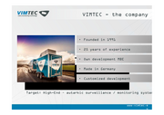 VIMTEC - the company • Founded in 1991 • 25 years of experience • Own development MBE • Made in Germany • Customized development Target: High- High-End – autarkic surveillance / monitoring systems www.vimtec.e u