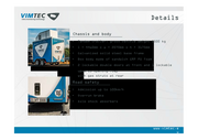 Details Chassis and body • Tandem trailer, gross vehicle weight 2500 kg • l = 4460mm x w = 2070mm x h = 3175mm • Galvanized solid steel base frame • Box body made of sandwich GRP PU foam • 2 lockable double doors at front and 1 lockable upwards opening flap with gas struts at rear Road safety • Admission up to 100km/h • Overrun brake • Axle shock absorbers www.vimtec.e u