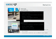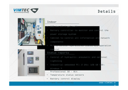 Details Indoor • 880 Ah/ 24 V gel cell • Battery controller to monitor and control the power storage system • Cabinet to control all information and network components • PLC to monitor operational status and operation control Status reports • Control of hydraulic, pneumatic and optional lightning • Industrial embedded PC, 2 GHz, 128 GB SSD, Windows 7 Professional 32 – Bit • Temperature status sensors • Battery control display • Tank level display www.vimtec.e u