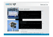 Details Diesel generator • Up to 120 days self sufficient - 200l fuel tank • 5 kVA power - fuel consumption 0.6 – 1.0 litres per hour • Diesel generator engine management • Powered by a hybrid system Observation technology • The pneumatic mast can take a weight up to 120 kg • Mast – up to 8m • Masthead quick change System • Compatible with different observation technologies • The Masthead includes a VPN router, an un- www.vimtec.e managed switch and u a high performance outdoor antenna