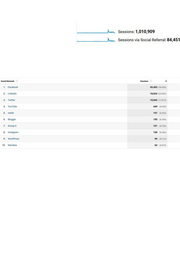 — m Sessions: 1,010,909 0 Au Sessions via Social Referral: 84,451 Social Network Sessions ’ v 1. Facebook 49,403 (58.50%) 2. Linkedin 18,624 (22.05%) 3. Twitter 15,042 (17.81%) 4. YouTube 449 (0.53%) 5. reddit 197 (0.23%) 6. Blogger 155 (0.18%) 7. Scoop.it 151 (0.18%) 8. Instagram 150 (0.18%) 9. WordPress 90 (0.11%) 10. Netvibes 63 (0.07%)