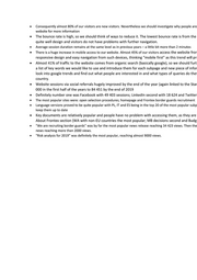 Consequently almost 80% of our visitors are new visitors. Nevertheless we should investigate why people are website for more information The bounce rate is high, so we should think of ways to reduce it. The lowest bounce rate is from the quite well design and visitors do not have problems with further navigation. Average session duration remains at the same level as in previous years - a little bit more than 2 minutes There is a huge increase in mobile access to our website. Almost 45% of our visitors access the website fror responsive design and easy navigation from such devices, thinking “mobile first” as this trend will prı Almost 41% of traffic to the website comes from organic search (basically google), so we should furt a list of key words we would like to use and introduce them for each subpage and new piece of infor look into google trends and find out what people are interested in and what types of queries do the\ country. Website sessions via social referrals hugely improved by the end of the year (again linked to the Star 000 in the first half of the years to 84 451 by the end of 2019 Definitely number one was Facebook with 49 403 sessions; LinkedIn second with 18 624 and Twitter The most popular sites were: open selection procedures; homepage and Frontex border guards recruitment Language versions proved to be quite popular with PL, IT and ES being in the top 20 of the most popular subp keep them up to date Key documents are relatively popular and people have no problem with accessing them, as they are About Frontex section (WA with non-EU countries the most popular; MB decisions second and Budg “We are recruiting border guards” was by far the most popular news release reaching 34 423 views. Then the news reaching more than 2000 views. “Risk analysis for 2019” was definitely the most popular, reaching almost 9000 views.