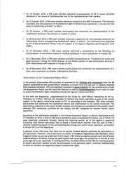 e On 10 October 2018, a FRO team member delivered a presentation of FR in return activities delivered in the course of familiarisation visit of the representatives from Gambia. e On 12 October 2018, aFRO team member delivered a speech at the AMIF Conference “The National Guarantor and the protection of fundamental rights in forced return operations: a survey over two years of monitoring activities” in Rome. e On 18 October, a FRO team member participated and monitored the implementation of the readmission operation from Greece to Turkey in Lesvos. e On 26 November 2018, a FRO team member delivered a speech at the international conference on “Monitoring returns strengthening fundamental rights” in Athens. The conference was organized by the Greek Ombudsman Office, with the support of the Asylum, Migration and Integration Fund (AMIF). e On 27 November 2018, a FRO team member delivered a presentation at the Workshop on harmonization of procedures related to medical assistance in return operations in Frontex HQ. e On 14 December 2018, a FRO team member provided a presentation on “Conditions for action and good practices” during the IPCAN Seminar on the Police conduct of law enforcement services in their relationships with migrants in Europe in Paris. e On 18 December 2018, FRO team members participated and monitored the implementation of a joint return operation to Gambia, organised by Germany. Observations of the Fundamental Rights Officer In the present Observations FRO provides an overview of the findings and conclusions from the 85 reports submitted by the forced-return monitors activated from the pool and 21 reports received from national monitors. FRO also highlights examples of good practices for the consideration of both the Management Board and the Executive Director as well as recommendations to act upon in order to ensure fundamental rights compliance during the Agency’s return activities. In line with the Regulation, complemented by the Guide for Joint Return Operations by Air co- ordinated by Frontex, FRO has the mandate to monitor any return operation as part of the overall support to the Agency monitoring system of FR. In exercising of the mandate, FRO team members participated and monitored two operations (return and readmission) in the period concerned. The observations collected in the course of both missions are included and complement the present report whereby FRO monitoring activities do not replace the MS’ obligation to monitor forced return operations. According to the information provided in the Frontex Evaluation Report on Return Operations in the 2"d Semester of 2018, a total of 180 return operations were co-ordinated by Frontex, out of which 119 were physically monitored. Notably, during the reporting period, all of the Agency’s supported Collecting Joint Return Operations had on-board a forced-return monitor from the pool or from a national monitoring system of the participating MSs through the entire return operation, as foreseen in Article 28 (3) of the Regulation. In general terms, FRO notes that there are no Serious Incident Reports submitted by participants in the operations. However, there have been a number of incidents reported by the monitors, which triggered follow up and are underlined in this report. FRO wishes to express concern over the different understanding of incidents among the participants and encourages the authorities of the MS as well as the Agency to use, especially in training activities, the Observations of the FRO for training purposes of escorts and escort leaders so that all participants in the operation share a common understanding of when an incident can negatively impact fundamental rights. 2/6