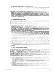4. Right to privacy and property of persons returned In the 2"d semester of 2018, forced-return monitors reported about the incidents that allegedly might result in a violation of the right to property of the persons pending removal, as follows: e As noticed in some monitoring reports, valuable personal belongings should not been placed in the baggage hold of the aircraft. They should be stored in the sealed envelope or a plastic bag and marked with the name of returnee, and kept by the respective escort. FRO would recommend to strengthen luggage handling procedures in the upcoming revision of the Guide on JROSs currently ongoing within the Agency. This element has been already highlighted by FRO in her observations covering the 1° semester of 2018. 5. Treatment of vulnerable groups In the preparation and throughout the implementation of operations, special consideration should be given to vulnerable persons such as children, disabled persons, elderly people, pregnant women, etc. Some observations provided by the forced-returned monitors include: e In general, as a good practice, it was observed and recommended to let children play with toys and games. The establishment of a mobile playroom for children in the return terminal of the airport should be arranged for return operations, in particular with a high number of children to be returned. In this context FRO recommends to provide an adequate special care for families with children, including diapers and baby food to be accessible prior to embarkation as well as during the flight, which is a good practice to be followed. e Some forced-return monitors observed lack of individual treatment to be guaranteed for families with children and reported that families with children should have been enabled to board the aircraft separately and should have been seated separately from other returnees. FRO considers as a good practice, that vulnerable persons shall board the aircraft separately and shall be seated separately from other potentially violent returnees. e As reported, it was observed that the unaccompanied minors have been returned in two operations, which is not in accordance with Frontex general rules on conducting return as well as in contradiction to the Annex I of the Implementation Plan. Reported incidents were conducted in accordance with national law, but in contradiction with Frontex procedures. On the basis of those incidents a specific safeguard tool on unaccompanied minors was introduced into FAR system. FRO appreciates the development in this regard and at the same time recommends to continue a strong policy on raising awareness on a protection of the best interest of the child taking into account that unaccompanied minors are not allowed in return operations organised or coordinated by Frontex. 6. Use of force and means of restraint Article 7 of the CoC reflects the international and European standards on the use of force and means of restraint, which can be applied only in accordance to necessity, legality and proportionality principles, or in response to an immediate and serious risk. Any decision to use coercive measures has to be based on an individual risk assessment. The use of force require the application of specific techniques employed by trained staff, who is also submitted to periodical refresher training sessions, otherwise, although the mission of carrying out a forced repatriation is accomplished, potential risks to the physical safety and dignity of returnees might exist. e In several reported cases, the means of restraints were not used in accordance with principle of necessity and proportionality, for instance body-cuffing for considerable amount of time with no further explanation, but only a generic “assessment of authorities for a risk of potential violence”. In this regard FRO strongly recommends not to use restraints as a precaution measure, especially when they are on children, as this usage should always be based on a solid individual risk assessment. e As noticed in some monitoring reports, the list of authorised/forbidden restraints was not provided to the monitor. According to FRO, more attention should be paid in this regard to Article 7.4 of the CoC referring to the proper and in advance distribution of the list of authorised Lmmmmm———nn 5/6