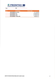 =Z FRONTEX EUROPEAN BORDER AND COAST GUARD AGENCY Type JRO BEA Destination 09/01/2018 FYROM-SRB 10/01/2018 ALB-RKS 16/01/2018 ALB-RKS 17/01/2018 ALB BLR-MDA PAK 18/01/2018 FYROM-SRB 19/01/2018 NGA 23/01/2018 AFG RUS 30/01/2018 ALB-RKS ARM GEO 31/01/2018 PAK TUN 01/02/2018 NGA 06/02/2018 PAK 14/02/2018 FYROM-SRB UKR-UZB 15/02/2018 ALB-RKS 19/02/2018 ARM-GEO 20/02/2018 AFG 21/02/2018 EGY 22/02/2018 PAK 26/02/2018 MDA-RKS SEN 28/02/2018 TUN 01/03/2018 GHA-NGA 07/03/2018 COL-DOM 08/03/2018 ALB-BIH-RKS 13/03/2018 FYROM-SRB 14/03/2018 ALB-RKS 15/03/2018 GEO-PAK 20/03/2018 ALB-BIH-MDA GMB 22/03/2018 RUS 26/03/2018 AFG 28/03/2018 FYROM-RKS-SRB PAK 05/04/2018 ARM 09/04/2018 AFG 10/04/2018 GMB-GHA 19/04/2018 GMB-NGA 24/04/2018 ALB-RKS 03/05/2018 ALB-RKS JOINT RETURN OPERATIONS WITH COSTS 2018 TOTAL PAID € 61,648.85 € 67,904.87 € 57,575.56 € 182,431.21 € 103,033.53 € 231,274.28 € 142,168.68 € 375,043.32 € 169,142.54 € 101,717.91 € 210,941.72 € 91,997.74 € 163,095.49 € 331,459.76 € 65,721.28 € 501,956.68 € 200,032.14 € 167,235.94 € 181,344.08 € 165,967.82 € 100,706.43 € 150,640.92 € 76,287.17 € 350,894.28 € 193,533.99 € 91,659.27 € 97,658.17 € 487,077.05 € 477,820.20 € 89,333.18 € 100,907.07 € 166,853.29 € 386,139.90 € 119,599.52 € 115,107.54 € 98,903.71 € 153,550.02 € 64,646.70 € 144,881.00 € 116,608.52 € 441,358.99 € 187,267.25 € 534,197.28 € 198,463.50 € 101,211.26