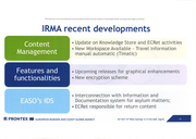 This document is not to be disclosed to any third party without the pri or consent of the European Border and Coast Guard Agency (Front ex) IRMA recent developments • Update on Knowledge Store and ECRet activities • New Workspace Available - Travel information manual automatic (Timatic) • Upcoming releases for graphical enhancements • New encryption scheme • Interconnection with Information and Documentation system for asylum matters; • ECRet responsible for return content iS: FRONT EX Ill EUROPEAN BORDER AND COAST GUARD AGENCY 54 th DCP 13 th PRAN meetings 12-13 Feb 2020, Zagreb