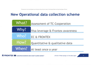 This document is not to be disclosed to any third party without the prior consent of the European Border and Coast Guard Agency (Frontex) New Operational data collection scheme What? Assessment of TC Cooperation Why? Visa leverage Et Frontex awareness r \1'.YA~r.:s.i) IEC Et FRONTEX Quantitative Et qualitative data At least once a year S: FRONT EX II EUROPEAN BORDER AND COAST GUARD AGENCY 54 th DCP 13 th PRAN meetings 12-13 Feb 2020, Zagreb