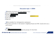 This document is not to be disclosed to any thi rd party without t he pri or consent of the European Border and Coast Guard Agency (Frontex) Discussion topic 1: ERRI N □ Wish list of priority TC and regions, e.g.: • Asia and Middle East: • Europe: • Africa: [Justification No 1 • Latin America • Maghreb □ Not suitable for reintegration assistance: • Visa-free countries in the eastern neighbourhood and WB: Could serve as a pull factor! • E.g. - □ Pilot: special groups of returnees i5: FRONT EX Ill EUROPEAN BORDER AND COAST GUARD AGENCY 54t h DCP 13 th PRAN meeti ngs 12-13 Feb 2020, Zagreb