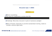 Thi s docu ment is not to be disclosed to any third party wi t hou t t he prior consent of the European Border and Coast Guard Agency (Fron tex) Discussion topic 1: ERRIN [Justification No 2 □ Return counselling: ■ Often done by independent entities like IOM □ Challenge: Returnees reluctant in spite of assistance pledged □ Role of Frontex: Especially to provide standardized training, needs to consider national legal bases as FRONT Ex III EUROPEAN BORDER AND coAsT GUARD AGENCY 54 th DCP 13 th PRAN meetings 12-13 Feb 2020, Zagreb