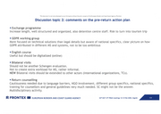 This document is not to be disclosed to any third party without the prior consent of the European Border and Coast Guard Agency (Frontex) Discussion topic 2: comments on the pre-return action plan ■ Exchange programme Increase length, well structured and organized, also detention centre staff. Risk to turn into tourism trip ■ GDPR working group More focused on technical solutions than legal details but aware of national specifics, clear picture on how GDPR attributed in different MS and systems, not to be too ambitious ■ English course Useful but should be digitalized (on line) ■ Bi lateral visits Should not be another Schengen evaluation. Not to create extra workload for MS, rather informal. NEW Bilateral visits should be extended to other actors (international organizations, TCs). ■ Return counselling Cautiousness needed due to language barriers, NGO involvement, different group specifics, national specifics, training for counsellors and general guidelines very much needed. SC might not be the answer. Multidisciplinary activity. i== FRONT EX Ill EUROPEAN BORDER AND COAST GUARD AGENCY 54 th DCP 13 th PRAN meetings 12-13 Feb 2020, Zagreb
