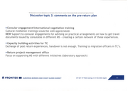 This document is not to be disclosed to any third party without the prior consent of the European Border and Coast Guard Agency (Frontex) Discussion topic 2: comments on the pre-return plan ■ Consular engagement/international negotiation training Cultural mediation trainings would be well appreciated. NEW Support to consular engagements for advising on practical arrangements on how to get travel documents issued by consulates in different MS - creating a certain network of these experiences. ■ Capacity building activities for TC Exchange of post return experiences, handover is not enough. Training to migration officers in TC 's. ■ Return project management office Focus on supporting MS with different initiatives (laboratory approach) iS FRONT EX Ill EUROPEAN BORDER AND COAST GUARD AGENCY 54 th DCP 13 th PRAN meetings 12-13 Feb 2020, Zagreb