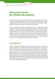 LIMITED Frontex European course for CIRAM risk analysts Why an EU course for CIRAM risk analysis? The idea of a European Course for CIRAM risk analysis appeared in the sec- ond part of 2016 following requests of several EU MS addressed to the Frontex Training Unit and the Frontex Risk Analysis Unit to take the initiative in organ- ising joint training sessions for risk analysts, CIRAM based. Frontex Training Unit invited EU MSs experts to join a meeting in Warsaw, May 2016. During the meeting, attending experts embraced the idea of a joint certification system under the umbrella of Frontex, based on Sectorial Quali- fication Framework, aiming to harmonise the profile, competences and even- tually the practices in the field of risk analysis at European level, fostering the implementation and use of CIRAM and promoting a smooth European coop- eration in border management-related risk analysis. This decision paved the way to the first European Course for CIRAM risk analysts. EU certification What is a CIRAM risk analyst? Without a common answer to such question, any discussion about EU certification of CIRAM risk analysts has no substance. During the initial discussions with EU MSs experts, in May 2016, the word ‘op- erator’ – proposed to be used, raised concerns due to the fact, in common lan- guage, ‘operator’ is connected to the picture of persons operating a machine/ equipment. However, in the context of CIRAM, the risk analyst is not a person who operates a certain machine but a fully specialised member of staff with a high degree of independence and analytical thinking, performing professional tasks based on the Common Integrated Risk Analysis Model within the scope of Integrated Border Management. 6