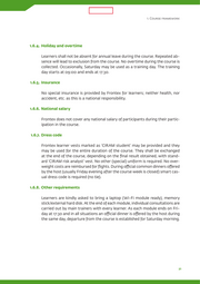LIMITED 1. Course framework 1.6.4. Holiday and overtime Learners shall not be absent for annual leave during the course. Repeated ab- sence will lead to exclusion from the course. No overtime during the course is collected. Occasionally, Saturday may be used as a training day. The training day starts at 09:00 and ends at 17:30. 1.6.5. Insurance No special insurance is provided by Frontex for learners; neither health, nor accident, etc. as this is a national responsibility. 1.6.6. National salary Frontex does not cover any national salary of participants during their partic- ipation in the course. 1.6.7. Dress code Frontex learner vests marked as ‘CIRAM student’ may be provided and they may be used for the entire duration of the course. They shall be exchanged at the end of the course, depending on the final result obtained, with stand- ard ‘CIRAM risk analyst’ vest. No other (special) uniform is required. No over- weight costs are reimbursed for flights. During official common dinners offered by the host (usually Friday evening after the course week is closed) smart cas- ual dress code is required (no tie). 1.6.8. Other requirements Learners are kindly asked to bring a laptop (Wi-Fi module ready), memory stick/external hard disk. At the end of each module, individual consultations are carried out by main trainers with every learner. As each module ends on Fri- day at 17:30 and in all situations an official dinner is offered by the host during the same day, departure from the course is established for Saturday morning. 21