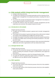 LIMITED 2. Common Core Curriculum 2. Common Core Curriculum 2.1. Risk analysis within integrated border management Category learning outcomes: To explain the meaning of risk analysis generally and the meaning of inte- grated border management risk analysis particularly, including the role of CIRAM; To connect the concept of integrated border management risk analysis to various legal provisions in force at EU level; To justify the need for using risk analysis in border management and the importance of a common risk analysis model at EU level. 2.1.1. Introduction to risk analysis Chapter learning outcomes To define the risk analysis concept in general and in border management particularly; To list types of risk analysis in general and types of law enforcement-related risk analysis while highlighting the differences between them; To explain risk analysis’ crucial role in border and security situation awareness; To explain the added value of having harmonised procedures in risk anal- ysis at EU level; To distinguish Frontex risk analysis procedures, their outcomes/similarities/ differences with other organisations with law enforcement tasks. 2.1.2. Schengen Border Code Chapter learning outcomes To describe the connection between the Schengen Borders Code and risk analysis including the evolution through its amendments and supportive documents; To list the CIRAM references under the Schengen Borders Code; To justify the need for conducting regular and EU-compliant risk analysis for effective and cost‑efficient border management. 2.1.3. EBCG regulation Chapter learning outcomes To list the main events of the historical process that led to the establish- ment of the Agency; To list the main events of the historical process that led to the establish- ment of the CIRAM; 25