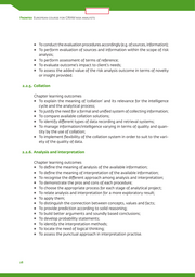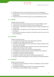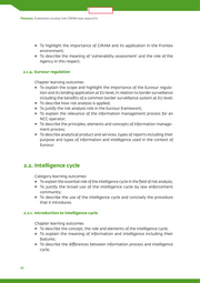 LIMITED 2. Common Core Curriculum To define and list sources of information and sources of intelligence; To describe the most common types of information (by structure/validation/ classification); To describe the most common types of sources (open/official sources). 2.2.2. Tasking Chapter learning outcomes To describe the meaning of tasking and its role in the intelligence cycle; To divide tasks into small components based on defined rules; To formulate a hypothetical running log of tasks, identify challenges and set priorities; To define terms of reference and the relevance of terms of reference for risk analysis; To describe the procedures required, the elements and the structure of terms of reference. 2.2.3. Collection Chapter learning outcomes To recognise the fundamental role of information collection; To explain the principles of data collection; To identify the data eligible and the sources that could be exploited within the scope of risk analysis; To examine the legitimacy and consistency of sources that could be ex- ploited within the scope of risk analysis; To demonstrate the techniques for generating hypothesis; To schedule the procedure, sources and time needed for the collection; To identify the need and develop indicators; To identify the need for security clearances; To develop a collection plan based on existing techniques/rules; To perform a downward progression of the analytical task through indicators. 2.2.4. Evaluation Chapter learning outcomes To define the scope of evaluation within the intelligence cycle and within the analytical process; To integrate the evaluation principles in the analytical procedures; To distinguish between different types of evaluation; 27