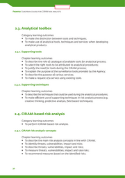 LIMITED Frontex European course for CIRAM risk analysts 2.3. Analytical toolbox Category learning outcomes To make the distinction between tools and techniques; To make use of analytical tools, techniques and services when developing analytical products. 2.3.1. Supporting tools Chapter learning outcomes To describe the role of catalogue of available tools for analytical process; To select the right tools to be attributed to analytical procedures; To justify the need for tools during the CIRAM process; To explain the purpose of the surveillance tools provided by the Agency; To describe the purpose of various services; To make a request of a service using existing tools. 2.3.2. Supporting techniques Chapter learning outcomes To describe the techniques that could be used during the analytical procedures; To make efficient use of supporting techniques in risk analysis process (e.g. creative thinking, predictive analysis, field based techniques). 2.4. CIRAM-based risk analysis Category learning outcomes To perform CIRAM-based risk analysis. 2.4.1. CIRAM risk analysis concepts Chapter learning outcomes To describe the main risk analysis concepts in line with CIRAM; To identify threats, vulnerabilities, impact and risks; To describe threats, vulnerabilities, impact and risks; To measure threats, vulnerabilities, impact and rate risks; To recommend measures based on the identified risks. 30