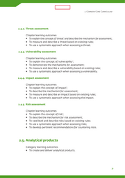 LIMITED 2. Common Core Curriculum 2.4.2. Threat assessment Chapter learning outcomes To explain the concept of ‘threat’ and describe the mechanism for assessment; To measure and describe a threat based on existing rules; To use a systematic approach when assessing a threat. 2.4.3. Vulnerability assessment Chapter learning outcomes To explain the concept of ‘vulnerability’; To demonstrate the mechanisms for assessment; To measure and describe a vulnerability based on existing rules; To use a systematic approach when assessing a vulnerability. 2.4.4. Impact assessment Chapter learning outcomes To explain the concept of ‘impact’; To describe the mechanism for assessment; To measure and describe an impact based on existing rules; To use a systematic approach when assessing the impact. 2.4.5. Risk assessment Chapter learning outcomes To explain the concept of ‘risk’; To describe the mechanism for risk assessment; To rate/level and describe risks based on existing rules; To use a systematic approach when assessing risks; To develop pertinent recommendations for countering risks. 2.5. Analytical products Category learning outcomes To create and deliver analytical products. 31