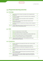 LIMITED 3. Course design 3.3. Programme learning outcomes 3.3.1. Knowledge K Explain the connection between risk analysis and EU Integrated Border 4 Management K Describe the intelligence cycle and its relevance for border management 5 risk analysis products K Describe risk analysis process and products used for comprehensive 5 border management K Outline various sources and types of information useful for border 5 management risk analysis K Justify the importance of ‘outside the box’ thinking in border management 5 risk analysis SQF LO: Describe a defined range of national, EU and international law, policies, rules and 5 procedures relevant to border guarding activities. 3.3.2. Skills S Perform risk analysis tasks in line with CIRAM 5 S Prepare risk analysis products in line with CIRAM 5 S Brief specific audiences in border management risk analysis-related topics 5 S Present orally risk analysis products to an operational audience 5 S Identify case-based cooperation partners at national/EU level 5 SQF LO: Apply specialised knowledge and skills in border guarding areas that require 5 specialised professional competences. 3.3.3. Competences C Promote cooperation and cooperate with other units in scope of CIRAM 5 implementation C Take responsibility for the quality of analytical products delivered 5 C Take responsibility for the information exchanged with other units/ 5 agencies C Ensure the reliability, integrity and validity of information collected for risk 5 analysis C Ensure protection of fundamental rights when performing risk analysis 5 tasks (e.g. personal data) SQF LO: Ensure that the CIRAM risk analyst integrates and promotes the fundamental 5 rights of all persons in its processes and takes initiatives within the scope of EU CIRAM cooperation. 37