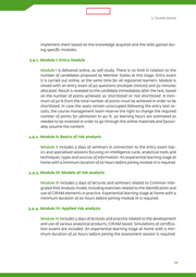 LIMITED 3. Course design implement them based on the knowledge acquired and the skills gained dur- ing specific modules. 3.4.1. Module I: Entry module Module I is delivered online, as self-study. There is no limit in relation to the number of candidates proposed by Member States at this stage. Entry exam it is carried out online, at the same time for all registered learners. Module is closed with an entry exam of 40 questions (multiple choices) and 50 minutes allocated. Result is revealed to the candidate immediately after the test, based on the number of points achieved, as ‘shortlisted’ or ‘not shortlisted’. A mini- mum of 50 % from the total number of points must be achieved in order to be shortlisted. In case the seats remain unoccupied following the entry test re- sults, the course management team reserve the right to change the required number of points for admission to 40 %. 30 learning hours are estimated as needed to be invested in order to go through the online materials and favour- ably assume the content. 3.9.2. Module II: Basics of risk analysis Module II includes 5 days of seminars in connection to the entry exam top- ics and specialised sessions focusing on intelligence cycle, analytical tools and techniques, types and sources of information. An experiential learning stage at home with a minimum duration of 20 hours before joining module III is required. 3.4.3. Module III: Models of risk analysis Module III includes 5 days of lectures and seminars related to Common Inte- grated Risk Analysis model, including exercises related to the identification and use of CIRAM elements in practice. Experiential learning stage at home with a minimum duration of 20 hours before joining module III is required. 3.4.4. Module IV: Applied risk analysis Module IV includes 5 days of lectures and practice related to the development and use of various analytical products, CIRAM based. Simulations of certifica- tion exams are included. An experiential learning stage at home with a min- imum duration of 20 hours before joining the assessment session is required. 39