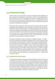 LIMITED Frontex European course for CIRAM risk analysts 3.5. Assessment strategy After the entry test, each learner received immediate online feedback not only in relation to the general result but also in relation to the justification for each individual answer. The meaning of the test is to validate the access to the course only to the learners fulfilling the minimum requirements set and to clarify the expectations. Result of the entry test is also taken into account during the certification test (graded). After each interim assessment (first day of each module) the learner receives immediate online feedback not only in relation to the result but also the jus- tification for each individual answer. The meaning of the test is to ensure the previous knowledge was assimilated so the learners have the right basis to step in the next module. At the same time, the result of the interim assessments are also taken into account during the certification test (graded). Therefore it is expected that motivation to learn remains constant for the entire course duration (not only during the certification session). During the certification session, assessment strategy measures – in order – the level of acquired knowledge (knowledge test), the level of practical skills (practical test) and the capacity to analyse information (competence/analyti- cal test). All tests must be passed in order to be certified as a CIRAM risk an- alyst. However, the learner is obliged to seek a ‘higher that satisfactory’ score in at least one of the tests in order to be able to reach the minimum number of points required to be certified. Passing all tests with a minimum number of points cannot fulfil the quality standards set for certification. Four differ- ent evaluators will assess the performance in all these tests and they must reach, basically, the same individual score under every test (+/– 1 point out of a maximum of 20). 3.5.1. Assignment of course trainers Only experienced border management staff certified by Frontex Training Unit as ‘CIRAM risk analyst’ (with a minimum overall grade ‘good’) may be assigned as ‘CIRAM main trainer’. Main trainers are bound to attend all sessions of the course, delivering training and providing feedback to learners. Specialised topics are to be covered by the Agency’s internal staff (e.g. Risk Analysis Unit, Fron- tex Situation Centre). Assigned CIRAM main trainers are obliged to attend a Frontex train the trainer’s certification course within a maximum of 1 year fol- lowing the date of their nomination. ‘CIRAM main trainers’: 40