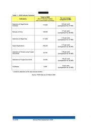 Table 1: 2008 Indicator factsheet Total in 2008 Per cent change Indicators (for 27 Member States compared to 2007 and 2 associated countries) Detections of Illegal Border +24 per cent 174,800 Crossing* (comparison for 27 MS) -17 per cent Refusals of Entry 129,500 (comparison for 28 MS) +13 per cent Detections of Illegal Stay 411,800 (comparison for 27 MS) +17 per cent Asylum Applications 248,200 (comparison for 28 MS) Detections of Persons using Forged +16 per cent 20,700 Documents (comparison for 25 MS) -18 per cent Detections of Forged Documents 24 ,500 (comparison for 20 MS) -9 per cent Facilitators 9,200 (comparison for 23 MS) * Limited to detections at the land and sea borders. Source: FRAN data as of 9 March 2009 10 of 80 Annual Risk Assessment 2009