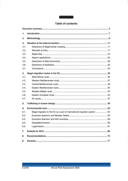 Table of contents Executive summary ................................................................................................................. 3 1. Introduction ...................................................................................................................... 7 2. Methodology .................................................................................................................... 8 3. Situation at the external borders .................................................................................. 11 3.1. Detections of illegal border crossing ........................................................................ 11 3.2. Refusals of entry ...................................................................................................... 17 3.3. Illegal stay ............................... .. ... ........... ............. ....... ... ... ....................................... 22 3.4. Asylum applications ............................................ ................... .................. ................ 25 3.5. Detections of false documents ................................................................................. 28 3.6. Detections of facilitators ........................................................................................... 32 3. 7. Conclusions ............................................................................................................. 34 4. Illegal migration routes to the EU ................................................................................. 36 4.1. West African route ................................................................................................... 36 4.2. Western Mediterranean route .............. .. ..................... .. ...... ..................................... 37 4.3. Central Mediterranean route .................................................................................... 38 4.4. Eastern Mediterranean route ................................................................................... 42 4.5. Western Balkan route .............................................................................................. 44 4.6. Eastern European route ........................................................................................... 45 4.7. Air routes .............. ........... .................................................... ..... ............. .. ......... ....... 47 5. Trafficking in human beings ......................................................................................... 50 6. Environmental scan ....................................................................................................... 52 6.1. Illegal migration to the EU as a part of international migration system .......... ........ .. 52 6.2. Economic downturn and Member States .... ............................................................. 53 6.3. Economic downturn and third countries ................................................................... 56 6.4. Geopolitical factors .................................................................................................. 58 6.5. Legal factors ............................................................................................................ 61 7. Outlook for 2010 ............................................................................................................ 66 8. Recommendations ......................................................................................................... 72 9. Annexes .......................................................................................................................... 77 5 of 80 Annual Risk Assessment 2009