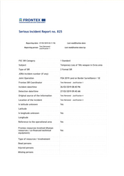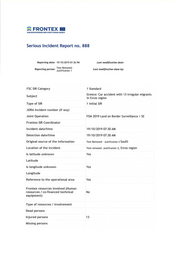 ~ FRONTEX IIJ EUROPEAN BORDER AND COASTGUARD AGENCY Serious Incident Report no. 825 Reporting date: 27/03/201904:11 PM Last modification date: . Text Removed - Reporting person: Justification 1 Last modification done by: FSC SIR Category 1 Standard Subject Temporary Loss of TM's weapon in Evros area Type of SIR 2 Formal SIR JORA Incident number (if any) Joint Operation FOA 2019 Land on Border Surveillance / SE Frontex SIR Coordinator Text Removed - Justification 1 Incident date/time 26/03/2019 08:40 PM Detection date/time 27/03/2019 09:40 AM Original source of the information Text Removed - Justification 4 Location of the incident Text Removed - Justification 3 Is latitude unknown Yes Latitude Is longitude unknown Yes Longitude Reference to the operational area Yes Frontex resources involved (Human resources I co-financed technical Yes equipment) Type of resources I involvement Dead persons Injured persons Missing persons