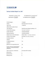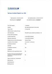 ~ FRONTEX Ill EUROPEAN BORDER AND COAST GUARD AGENCY Serious Incident Report no. 836 Reporting date: 21/04/2019 10:03 PM Last modification date : 21/04/2019 10:04 PM . Text Removed - L t d I·t· t · d b Text Removed - Reporting person: Justification 1 as mo rca ron one y: Justification 1 FSC SIR Category 1 Standard Subject One dead body found in Evros area Type of SIR 2 Formal SIR JORA Incident number (if any) Joint Operation FOA 2019 Land on Border Surveillance / SE Frontex SIR Coordinator Incident date/time 21/04/2019 07:00 AM Detection date/time 21/04/2019 07:00 AM Original source of the information Hellenic Police Location of the incident Text Removed - Justification 3 Is latitude unknown Yes Latitude Is longitude unknown Yes Longitude Reference to the operational area No Frontex resources involved (Human resources I co-financed technical No equipment) Type of resources / involvement Dead persons Inj ured persons Missing persons