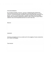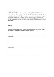 Information / al legations On 19.10.2019 at 07:30hrs Text Removed - Justification 4, during their patrol, detected one vehicle that had overturned, due to its high speed, in the Rural Road close to Text removed- Justification 3. At that time thirteen (13) persons (13 AFG) on board have been reported by Text Removed - Justification 4 on spot and the driver - facilitator was escaped. All of the irregular migrants were transported to Didymoteicho Hospital in order to receive the proper medical treatment, they are still hospitalized and there is no risk for their lives. Measures Assessment Preliminary investigation for the car accident and for the smuggling of humans conducted by B.C.U. Soufli is still ongoing. Final outcome