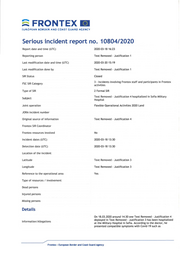 ::: FRONTEX E'UROPEAH BOROER ANO COAST vUAR.C AGENCY m Serious incident report no. 10804/2020 Report date and time (UTC) 2020-03-18 16: 23 Reporting person Text Removed - Justification 1 Last modification date and time (UTC) 2020-03-20 15: 19 Last modification done by Text Removed - Justification 1 SIR Status Closed 3 - Incidents involving Frontex staff and participants in Frontex FSC SIR Category activities Type of SIR 2 Formal SIR Text Removed - Justification 4 hospitalized in Sofia Military Subject Hospital Joint operation Flexible Operational Activities 2020 Land JORA incident number Original source of information Text Removed - Justification 4 Frontex SIR Coordinator Frontex resources involved No Incident dates (UTC) 2020-03-18 13: 30 Detection date (UTC) 2020-03-18 13:30 Location of the incident Latitude Text Removed - Justification 3 Longitude Text Removed - Justification 3 Reference to the operational area Yes Type of resources / involvement Dead persons Injured persons Missing persons Details On 18.03.2020 around 14:30 one Text Removed - Justification 4 deployed in Text Removed - Justification 3 has been hospitalized Information/ Allegations at the Military Hospital in Sofia. According to the doctor, he presented compatible symptoms with Covid-19 such as Frontex • European Border and Coast Guard Agency