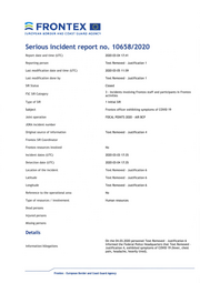 ::: FRONTEX EUROPEAN 80ROER ANO COAST tiUARO AGE NC'I' Serious incident report no. 10658/2020 Report date and time (UTC) 2020-03-04 17:41 Reporting person Text Removed - Justification 1 Last modification date and time (UTC) 2020-03-05 11: 59 Last modification done by Text Removed - Justification 1 SIR Status Closed 3 - Incidents involving Frontex staff and participants in Frontex FSC SIR Category activities Type of SIR 1 Initial SIR Subject Frontex officer exhibiting symptoms of COVID 19 Joint operation FOCAL POINTS 2020 - AIR BCP JORA incident number Original source of information Text Removed - Justification 4 Frontex SIR Coordinator Frontex resources involved No Incident dates (UTC) 2020-03-03 17: 35 Detection date (UTC) 2020-03-04 17:35 Location of the incident Text Removed - Justification 6 Latitude Text Removed - Justification 6 Longitude Text Removed - Justification 6 Reference to the operational area No Type of resources / involvement Human resources Dead persons Injured persons Missing persons Details On the 04.03.2020 personnel Text Removed - Justification 6 informed the Federal Police Headquarters that Text Removed - Information/ Allegations Justification 4, exhibited symptoms of COVID 19 (fever, chest pain, headache, heavily tired). Frontex • European Border and Coast Guard Agency
