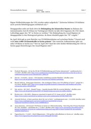 Wissenschaftliche Dienste Sachstand Seite 7 WD 2 - 3000 - 029/18 Eigene Waffenlieferungen der USA wurden später aufgedeckt. Zeitweise bildeten US-Soldaten 14 auch syrische Rebellengruppen militärisch aus. 15 Demgegenüber steht seit Ende 2014 die Bekämpfung des Islamischen Staates im Rahmen der internationalen Anti-IS-Allianz im Vordergrund. Bereits im Jahr 2014 begannen die USA damit, Luftschläge gegen den “IS” in Syrien zu verüben. Die Bekämpfung des Assad-Regimes ist 16 demgegenüber in den Hintergrund getreten, da dieser ebenfalls gegen den “IS” vorgeht. 17 Im April 2016 gab es erste Berichte von US-Militäreinheiten auf syrischem Boden. Zurzeit sind 18 wohl etwa 2.000 US-Einsatzkräfte in Syrien präsent. Der russische Außenminister geht von 19 zehn US-Basen in Syrien aus. Erst im April 2017 fand der erste direkte Militärschlag der USA in 20 Syrien gegen Einrichtungen des Assad-Regimes statt. 21 14 Frederik Obermaier, „So hat die SZ die US-Waffenlieferung nach Syrien rekonstruiert“, sueddeutsche.de v. 12.9.2017, abrufbar unter: http://www.sueddeutsche.de/politik/fragen-und-antworten-so-hat-die-sz-die-us- waffenlieferung-nach-syrien-rekonstruiert-1.3664119. 15 Zeit.de v. 9.10.2015, „Syrien – USA beenden Ausbildung syrischer Rebellen“, abrufbar unter: https://www.zeit.de/politik/ausland/2015-10/syrien-usa-rebellen-ausbildung. 16 Raniah Salloum, „Krieg gegen Islamisten – Die wichtigsten Fakten zum US-Luftkrieg in Syrien”, spiegel.de v. 23.9.2014, abrufbar unter: http://www.spiegel.de/politik/ausland/is-islamischer-staat-bomben-auf-syrien- schwaechen-miliz-a-993209.html. 17 Vgl. zeit.de v. 20.7.2017, „Donald Trump – Amerika beendet Hilfe für syrische Rebellen“, abrufbar unter: https://www.zeit.de/politik/ausland/2017-07/donald-trump-usa-syren-cia-waffen-rebellen. 18 Reuters.com v. 28.4.2016, „Damascus concerned at reports of U.S. troops arrival”, abrufbar unter: https://www.reuters.com/article/us-mideast-crisis-syria-condemnation-idUSKCN0XP1XM. 19 Amanda Erickson, „6 basic questions about the war in Syria”, washingtonpost.com v. 15.4.2018, abrufbar unter: https://www.washingtonpost.com/news/worldviews/wp/2018/04/12/syria- explained/?noredirect=on&utm_term=.64900b53dc13. 20 Anna Samarina, „US-General: US-Präsenz in Syrien ist völkerrechtswidrig – Nach Sieg über IS kann Russland die USA ‚ausladen‘“, epochtimes.de v. 1.9.2017, abrufbar unter: https://www.epochtimes.de/politik/welt/us- general-us-praesenz-in-syrien-ist-voelkerrechtswidrig-nach-sieg-ueber-is-kann-russland-die-usa-ausladen- a2205041.html?text=1. 21 Tagesschau.de v. 7.4.2017, „Nach Giftgaseinsatz – USA greifen Luftwaffenbasis in Syrien an“, abrufbar unter: https://www.tagesschau.de/ausland/usa-syrien-luftangriff-103.html.