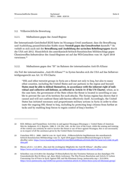 Wissenschaftliche Dienste Sachstand Seite 8 WD 2 - 3000 - 029/18 3.2. Völkerrechtliche Bewertung 3.2.1. Maßnahmen gegen das Assad-Regime Der Internationale Gerichtshof (IGH) hatte im Nicaragua-Urteil anerkannt, dass die Bewaffnung und Ausbildung paramilitärischer Kräfte einen Verstoß gegen das Gewaltverbot darstellt. So 22 verhält es sich auch mit der Bewaffnung und Ausbildung der syrischen Rebellengruppen durch die USA seit 2012. Hinsichtlich des amerikanisch-britisch-französischen Militärschlags gegen Chemiewaffen-Infrastruktur des Assad-Regimes sei auf das WD-Gutachten vom 18. April 2018 verwiesen. 23 3.2.2. Maßnahmen gegen den “IS” im Rahmen der internationalen Anti-IS-Allianz Als Teil der internationalen „Anti-IS-Allianz“ in Syrien berufen sich die USA auf das Selbstver- 24 teidigungsrecht aus Art. 51 VN-Charta: “ISIL and other terrorist groups in Syria are a threat not only to Iraq, but also to many other counties, including the United States and our partners in the region and beyond. States must be able to defend themselves, in accordance with the inherent right of indi- vidual and collective self-defense, as reflected in Article 51 if the UN Charter, when, as is the case here, the government of the State where the threat is located is unwilling or una- ble to prevent the use of its territory for such attacks. The Syrian regime has shown that it cannot and will not confront these safe-havens effectively itself. Accordingly, the United States has initiated necessary and proportionate military actions in Syria in order to elim- inate the ongoing ISIL threat to Iraq, including by protecting Iraqi citizens from further at- tacks and by enabling Iraqi forces to regain control of Iraq’s borders.“ 25 22 IGH, Military and Paramilitary Activities in and against Nicaragua (Nicaragua v. United States of America), Mer-its, Judgment, I.C.J. Reports, 1986, S. 119 Abs. 228: „In the view of the Court, while the arming and training of the contras can certainly be said to involve the threat or use of force against Nicaragua, this is not necessarily so in respect of all the assistance given by the United States Government.” 23 Gutachten WD 2 - 3000 - 048/18 vom 18. April 2018, „Völkerrechtliche Implikationen des amerikanisch- britisch-französischen Militärschlags vom 14. April 2018 gegen Chemiewaffeneinrichtungen in Syrien“, abrufbar unter: https://www.bundestag.de/blob/551344/f8055ab0bba0ced333ebcd8478e74e4e/wd-2-048-18-pdf- data.pdf. 24 Hierzu srf.ch v. 4.2.2015, „Das sind die wichtigsten Mitglieder der Anti-IS-Allianz“, abrufbar unter: https://www.srf.ch/news/international/das-sind-die-wichtigsten-mitglieder-der-anti-is-allianz. 25 Schreiben vom 23.9.2014 der damalige US-Botschafterin bei den Vereinten Nationen an den damaligen VN- Generalsekretär Ban Ki-Moon; vgl. dazu Marty Lederman, The War Powers Resolution and Article 51 Letters Concerning Use of Force in Syria Against ISIL and the Khorasan Group, justsecurity.org v. 23.9.2014, https://www.justsecurity.org/15436/war-powers-resolution-article-51-letters-force-syria-isil-khorasan-group/.
