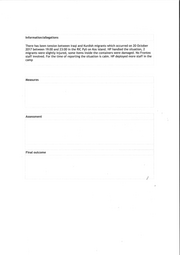 Information/allegations There has been tension between Iraqi and Kurdish migrants which occurred on 20 October 2017 between 19:00 and 23:00 in the RIC Pyli on Kos island. HP handled the situation, 2 migrants were slightly injured, some items inside the containers were damaged. No Frontex staff involved. For the time of reporting the situation is calm. HP deployed more staff in the camp Measures Assessment Final outcome