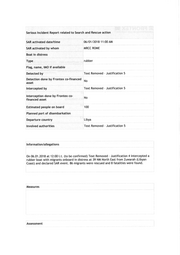 Serious Incident Report related to Search and Rescue action SAR activated date/time 06/01/2018 11:00 AM SAR activated by whom MRCC ROME Boat in distress Type rubber Flag, name, IMO if available Detected by Text Removed - Justification 5 Detection done by Frontex co-financed No asset Intercepted by Text Removed - Justification 5 Interception done by Frontex co- N i o financed asset Estimated people on board 100 Planned port of disembarkation Departure country Libya Involved authorities Text Removed - Justification 5 Information/allegations On 06.01.2018 at 12:00 l.t. (to be confirmed) Text Removed - Justification 4 intercepted a rubber boat with migrants onboard in distress at 39 NM North East from Zuwarah (Libyan Coast) and declared SAR event. 86 migrants were rescued and 8 fatalities were found. Measures Assessment