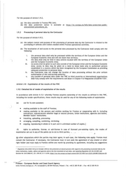 For the purpose of Article 11. 9. Z, (a) the data controller is Frontex PRU Unit; (b) the data protection notice is available at https: / /ec .europa.eu/info/data-protection -public - procurement-procedures en. 1.9.2 Processing of personal data by the Contractor For the purpose of Article II. 9.Z, (a) the subject matter and purpose of the processing of personal data by the Contractor is related to the purchasing of vehicles with trailers needed within Frontex operational activities. (b) The localisation of and access to the personal data processed by the Contractor shall comply with the following: i. the personal data shall only be processed within the territory of the European Union and the European Economic Area and will not leave that territory; ii. the data shall only be held in data centres located with the territory of the European Union and the European Economic Area; iii. no access shall be given to such data outside of the European Union and the European Economic Area; access to data may be given on a need to know basis only to authorised persons established in a country which has been recognised by the European Commission as providing adequate protection to personal data; iv. the Contractor may not change the location of data processing without the prior written authorisation of the contracting authority; v. any transfer of personal data under the FWC to third countries or international organisations shall fully comply with the requirements laid down in Chapter V of Regulation (EU)Z018/ 1725 1 • Article 1. 10 - Exploitation of the results of the FWC 1.10.1 Detailed list of modes of exploitation of the results In accordance with Article 11.13.1 whereby Frontex acquires ownership of the results as defined in this FWC, including the tender specifications, these results may be used for any of the following modes of exploitation: (a) use for its own purposes: • making available to the staff of Frontex; • making available to the persons and entities working for Frontex or cooperating with it, including contractors, subcontractors whether legal or natural persons, Union institutions, agencies and bodies, Member States' institutions; • installing, uploading, processing; • arranging, compiling, combining, retrieving; • copying, reproducing in whole or in part and in unlimited number of copies.] (f) rights to authorise, license, or sub-license in case of licensed pre-existing rights, the modes of exploitation set out in any of the points (a) to (e) to third parties., _., , , f (g) other adaptations which the parties may later agree; in such case, the following rules apply: Frontex must consult the Contractor. If necessary, the Contractor must in turn seek the agreement of any creator or other right holder and must reply to Frontex within one month by providing its agreement, including any suggestions ' Regulation (EU) 2018/ 1725 of 23 October 2018 on the protection of natural persons with regard to the processing of personal data by the Union institutions, bodies, offices and agencies and on the free movement of such data, and repealing Regulation (EC) No 4512001 and Decision No 1247/2002/EC, OJ L 295/39, 21.11.2018 , https:l/eur-lex .europa.eullegal-content/ENITXTIPDFl?url=CELEX:32018Rt725&.from=EN Frontex - European Border and Coast Guard Agency www.frontex.europa.eu I Pl. Europejski 6, 00-844 Warsaw, Poland I Tel. +48 22 205 95 00 I Fax +48 22 205 95 01
