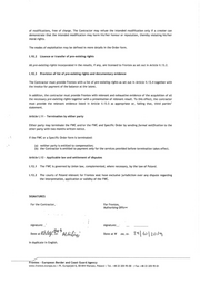 of modifications, free of charge. The Contractor may refuse the intended modification only if a creator can demonstrate that the intended modification may harm his/her honour or reputation , thereby violating his/her moral rights. The modes of exploitation may be defined in more details in the Order form. 1.10.2 Licence or transfer of pre-existing rights All pre-existing rights incorporated in the results, if any, are licensed to Frontex as set out in Article 11.13.2. 1.10.3 Provision of list of pre-existing rights and documentary evidence The Contractor must provide Frontex with a list of pre-existing rights as set out in Article 11.13.4 together with the invoice for payment of the balance at the latest. In addition, the contractor must provide Frontex with relevant and exhaustive evidence of the acquisition of all the necessary pre-existing rights together with a presentation of relevant result. To this effect, the contractor must provide the relevant evidence listed in Article 11.13.5 as appropriate or, failing that, third parties' statement. Article I. 11 - Termination by either party Either party may terminate the FWC and/or the FWC and Specific Order by sending formal notification to the other party with two months written notice. If the FWC or a Specific Order form is terminated: (a) neither party is entitled to compensation; (b) the Contractor is entitled to payment only for the services provided before termination takes effect. Article 1. 12 - Applicable law and settlement of disputes 1.12.1 The FWC is governed by Union law, complemented , where necessary, by the law of Poland. 1.12. 2 The courts of Poland relevant for Frontex seat have exclusive jurisdiction over any dispute regarding the interpretation, application or validity of the FWC. SIGNATURES For the Contractor, · For Frontex, Authorising Offic<>r signature: _' signature: _· oc'll't/df~ Done at ,j/.'/y,, on , / J.,{,/.i,v~I ' Done at W aw, or, 1-9 \ .(o \ '2,D) °) In duplicate in English. Frontex - European Border and Coast Guard Agency www.frontex.europa.eu I Pl. Europejski 6, 00-844 Warsaw, Poland I Tel. +48 22 205 95 00 I Fax +48 22 205 95 01