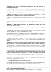 'Implementation of the FWC': the purchase of services envisaged in the FWC through the signature and performance of specific contracts; 'Interface control document': the guideline document which lays down the technical specifications, message standards, security standards, checks of syntax and semantics, etc. to facilitate machine-to-machine connection. This document is updated on a regular basis; 'Irregularity': any infringement of a provision of Union law resulting from an act or omission by an economic operator, which has, or would have, the effect of prejudicing the Union's budget. 'Notification' (or 'notify'): form of communication between the parties made in writing including by electronic means; 'Order form': a simplified form of specific contract by which the contracting authority orders services under this FWC; 'Performance of a specific contract': the execution of tasks and delivery of the purchased services by the contractor to the contracting authority; 'Personnel': persons employed directly or indirectly or contracted by the contractor to implement the FWC; 'Pre-existing material': any material, document, technology or know-how which exists prior to the contractor using it for the production of a result in the implementation of the FWC; 'Pre-existing right': any industrial and intellectual property right on pre-existing material; it may consist in a right of ownership, a licence right and/or right of use belonging to the contractor, the creator, the contracting authority as well as to any other third parties; 'Professional conflicting interest': a situation in which the contractor's previous or ongoing professional activities affect its capacity to implement the FWC or to perform a specific contract to an appropriate quality standard. 'Related person': any natural or legal person who is a member of the administrative, management or supervisory body of the contractor, or who has powers of representation, decision or control with regard to the contractor; 'Request for services': a document from the contracting authority requesting that the contractors in a multiple FWC with re-opening of competition provide a specific tender for services whose terms are not entirely defined under the FWC; 'Result': any intended outcome of the implementation of the FWC, whatever its form or nature. A result may be further defined in this FWC as a deliverable. A result may, in addition to newly created materials produced specifically for the contracting authority by the contractor or at its request, also include pre-existing materials; 'Specific contract': a contract implementing the FWC and specifying details of a service to be provided; 'Supplier portal': thee-PRIOR portal, which allows the contractor to exchange electronic business documents, such as invoices, through a graphical user interface. 11.2. Roles and responsibilities in the event of a joint tender In the event of a joint tender submitted by a group of economic operators and where the group does not have legal personality or legal capacity, one member of the group is appointed as leader of the group. Frontex - European Border and Coast Guard Agency www.frontex.europa.eu I Pl. Europejski 6, 00-844 Warsaw, Poland I Tel. +48 22 205 95 00 I Fax +48 22 205 95 01