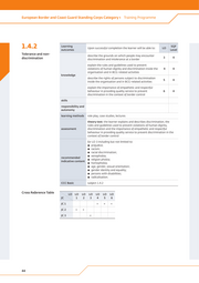 European Border and Coast Guard Standing Corps Category 1 Training Programme 1.4.2 Learning outcomes Upon successful completion the learner will be able to: LO SQF Level Tolerance and non- describe the grounds on which people may encounter discrimination 3 4 discrimination and intolerance at a border explain the rules and guidelines used to prevent violations of human dignity and discrimination inside the 4 4 organisation and in BCG-related activities knowledge describe the rights of persons subject to discrimination 5 4 inside the organisation and in BCG-related activities explain the importance of empathetic and respectful behaviour in providing quality service to prevent 6 4 discrimination in the context of border control skills responsibility and autonomy learning methods role play, case studies, lectures theory test: the learner explains and describes discrimination, the rules and guidelines used to prevent violations of human dignity, assessment discrimination and the importance of empathetic and respectful behaviour in providing quality service to prevent discrimination in the context of border control for LO 3 including but not limited to: ▪▪ prejudice; ▪▪ racism; ▪▪ racial discrimination; ▪▪ xenophobia; recommended ▪▪ religion phobia; indicative content ▪▪ homophobia; ▪▪ age, gender, sexual orientation; ▪▪ gender identity and equality; ▪▪ persons with disabilities; ▪▪ radicalisation. CCC Basic subject 1.4.2 Cross Reference Table LO LO LO LO LO LO LO JC 1 2 3 4 5 6 JC 1 × × × JC 2 × × JC 3 × 44