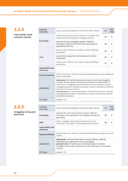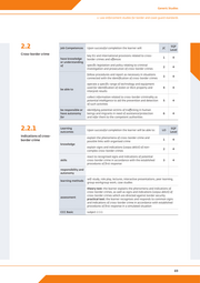 Generic Studies 2. Law enforcement studies for border and coast guard standards 2.2 Job Competences Upon successful completion the learner will: JC SQF Level Cross-border crime key EU and international provisions related to cross- have knowledge 1 4 border crimes and offences or understanding of specific legislation and policy relating to criminal 2 4 investigation and prosecution of cross-border crimes follow procedures and report as necessary in situations 3 4 connected with the identification of cross-border crimes operate a specific range of technology and equipment used for identification of stolen or illicit property and 4 4 be able to interpret results collect information related to cross-border criminality as potential intelligence to aid the prevention and detection 5 4 of such activities be responsible or identifying potential victims of trafficking in human have autonomy beings and migrants in need of assistance/protection 6 4 for and refer them to the competent authorities 2.2.1 Learning outcomes Upon successful completion the learner will be able to: LO SQF Level Indications of cross- explain the phenomena of cross-border crime and border crime 1 4 possible links with organised crime knowledge explain signs and indications (corpus delicti) of non- 2 4 complex cross-border crimes react to recognised signs and indications of potential skills cross-border crime in accordance with the established 3 4 procedures of first response responsibility and autonomy self-study, role play, lectures, interactive presentations, peer learning, learning methods group workgroup work, case studies theory test: the learner explains the phenomena and indications of cross-border crimes, as well as signs and indications (corpus delicti) of cross-border crimes which are directed against border security assessment practical test: the learner recognises and responds to common signs and indications of cross-border crime in accordance with established procedures of first response in a simulated situation CCC Basic subject 2.3.1 69