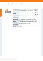 European Border and Coast Guard Standing Corps Category 1 Training Programme 2.2.2 Learning outcomes Upon successful completion the learner will be able to: LO SQF Level Modus operandi of explain types of modus operandi related to cross-border cross-border crimes 4 4 crimes knowledge identify indicators of possible modus operandi related to 5 4 cross-border crimes skills responsibility and autonomy learning methods small group work, team learning, case studies, lectures, role play theory test: the learner explains types of modus operandi related assessment to cross-border crimes and identifies indicators of possible modus operandi for LO 4 and LO 5 including but not limited to: recommended ▪▪ routes; indicative content ▪▪ methods of concealment CCC Basic subject 2.3.2 70