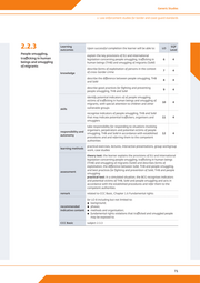Generic Studies 2. Law enforcement studies for border and coast guard standards 2.2.3 Learning outcomes Upon successful completion the learner will be able to: LO SQF Level People smuggling, explain the key provisions of EU and international trafficking in human legislation concerning people smuggling, trafficking in 6 4 beings and smuggling human beings (THB) and smuggling of migrants (SoM) of migrants describe forms of exploitation of persons in the context 7 4 knowledge of cross-border crime describe the difference between people smuggling, THB 8 4 and SoM describe good practices for fighting and preventing 9 4 people smuggling, THB and SoM identify potential indicators of of people smuggling, victims of trafficking in human beings and smuggling of 10 4 migrants, with special attention to children and other skills vulnerable groups recognise indicators of people smuggling, THB and SoM that may indicate potential traffickers, organisers and 11 4 smugglers take responsibility for responding to situations involving organisers, perpetrators and potential victims of people responsibility and smuggling, THB and SoM in accordance with established 12 4 autonomy procedures and and referring them to the competent authorities practical exercises, lectures, interactive presentations, group workgroup learning methods work, case studies theory test: the learner explains the provisions of EU and international legislation concerning people smuggling, trafficking in human beings (THB) and smuggling of migrants (SoM) and describes forms of exploitation, the difference between SoM, THB and people smuggling, and best practices for fighting and prevention of SoM, THB and people assessment smuggling practical test: in a simulated situation, the BCG recognises indicators and potential victims of THB, SoM and people smuggling and acts in accordance with the established procedures and refer them to the competent authorities. remark related to CCC Basic, Chapter 1.6 Fundamental rights for LO 8 including but not limited to: ▪▪ background; recommended ▪▪ phases; indicative content ▪▪ methods and organisation; ▪▪ fundamental rights violations that trafficked and smuggled people may be exposed to. CCC Basic subject 2.3.3 71