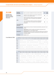 European Border and Coast Guard Standing Corps Category 1 Training Programme 2.2.10 Learning outcomes Upon successful completion the learner will be able to: LO SQF Level Economic and explain the main indicators of economic and financial financial crimes knowledge 36 4 crimes in a cross-border context with cross-border dimension gather information related to economic and financial cross-border crimes in accordance with established 37 4 procedures skills report information related to economic and financial cross-border crimes in accordance with established 38 4 procedures responsibility and autonomy practical exercises, lectures, interactive presentation, group work, case learning methods studies theory test: the learner explains the indicators of economic and financial crimes in a cross-border context assessment practical test: the learner follows information gathering and reporting procedures related to economic and financial cross-border crimes in a simulated situation CCC Basic subject 2.3.10 Cross Reference Table LO LO LO LO LO LO LO LO LO LO LO LO LO LO LO LO LO LO LO LO JC 1 2 3 4 5 6 7 8 9 10 11 12 13 14 15 16 17 18 19 JC 1 × × × × × × × × × JC 3 × × × × × × × × × × × × × × JC 4 × × × × JC 6 × × × × × × × × × × JC 2 × × × × × × × × × × JC 5 × × × × × × × × × × × × × × × × × LO LO LO LO LO LO LO LO LO LO LO LO LO LO LO LO LO LO LO LO JC 20 21 22 23 24 25 26 27 28 29 30 31 32 33 34 35 36 37 38 JC 1 × × × × × × × × × × JC 3 × × × × × × × × × × × × JC 4 × × × × × × × JC 6 JC 2 × × × × × × × × JC 5 × × × × × × × × × × 76